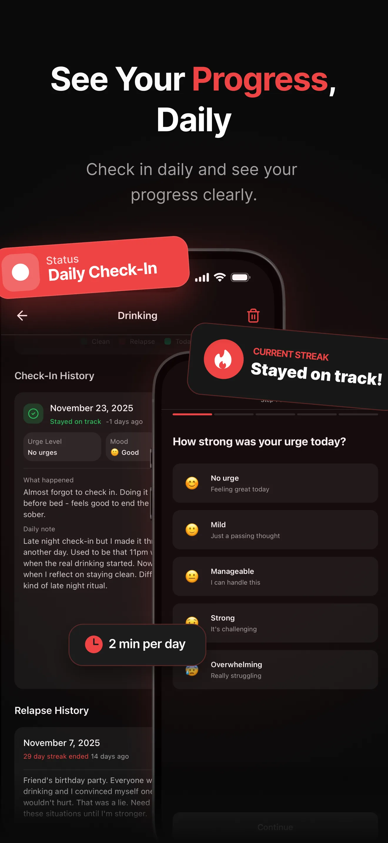 Log your mood, urges, and triggers each day. Takes under a minute.
